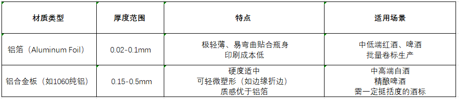 金屬鋁酒標牌常用兩種基材,需根據酒類定位匹配: